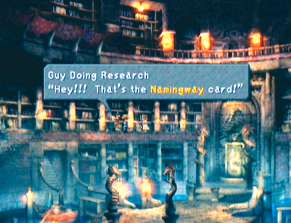 |  Pour renommer vos personnages, il vous faudra la Namingway Card. Vous pourrez gagner cette carte face à Mario pendant le tournoi de cartes de Treno. Vous pouvez aussi la trouver dans la chambre de Kuja, dans le Desert Palace, en cherchant derrière les livres qui se trouvent au premier plan.